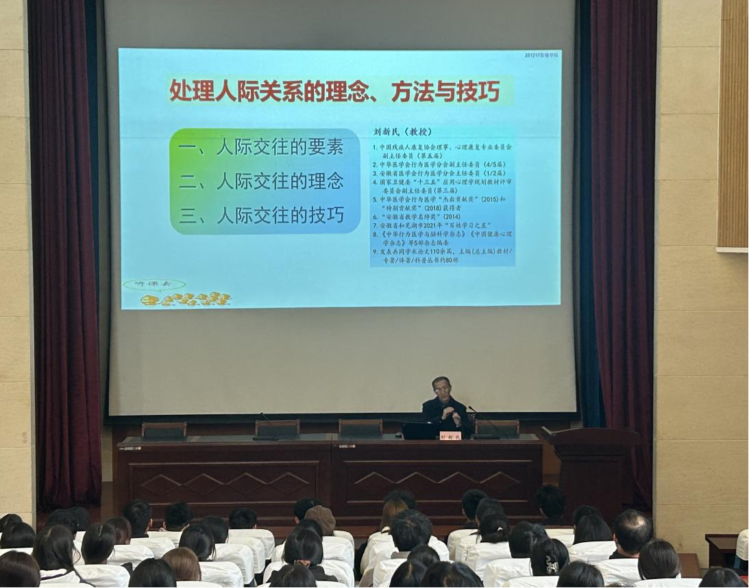 为提高大学生人际交往能力,营造和谐校园氛围,促进学生的提升与发展,12月17日,医学影像学院邀请校关工委“五老”报告团成员刘新民教授在逸夫科技楼一楼报告厅举办“处理好人际关系的理念、方法和技巧”专题讲座。学院2025级全体同学参加,2025级辅导员李宁主持会议。