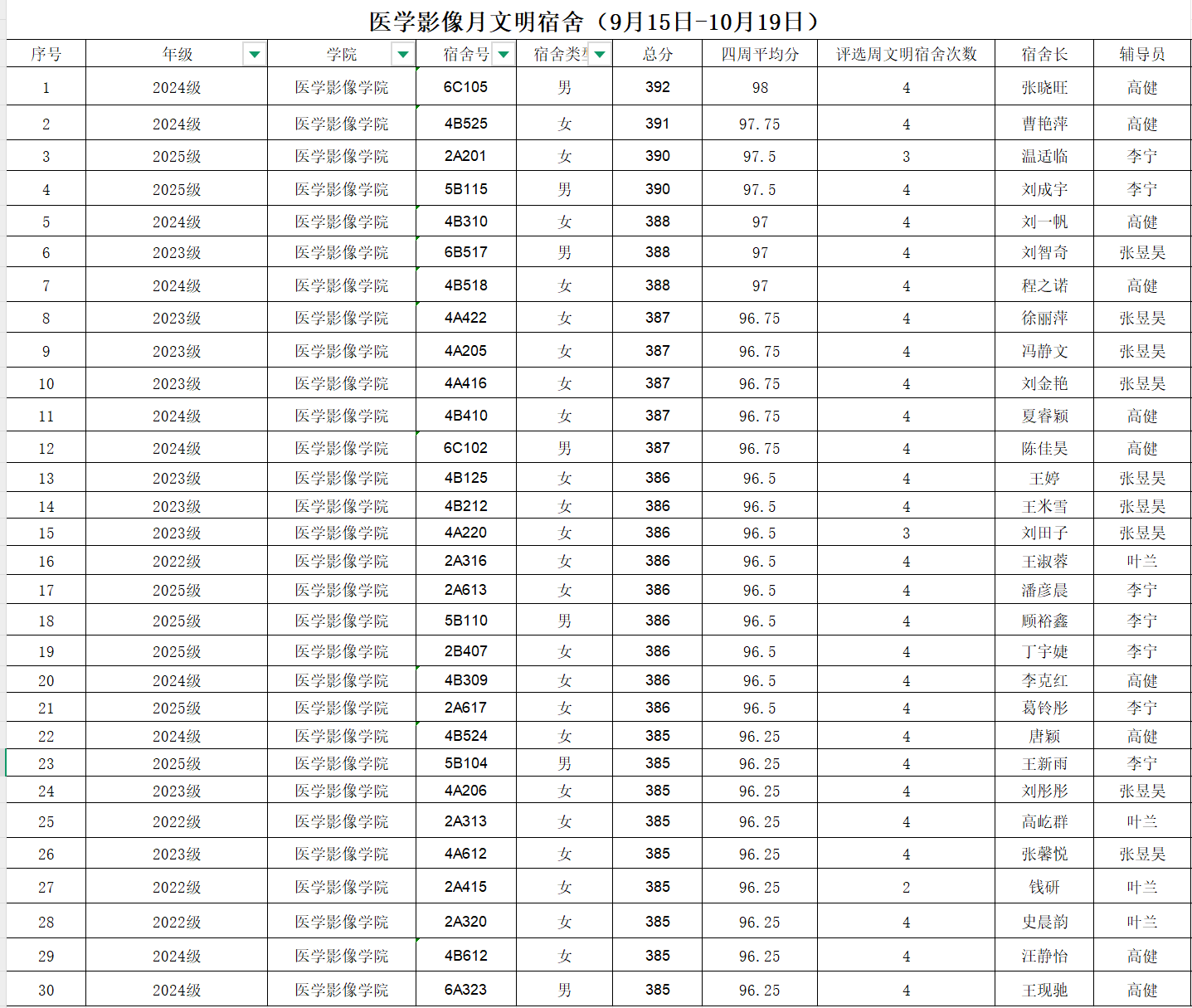 据《皖南医学院“安全文明宿舍”评选办法 (修订)》和《医学影像学院文明宿舍评选实施细则》文件要求及评选标准,共评选30间“月文明宿舍”,现进行公示。