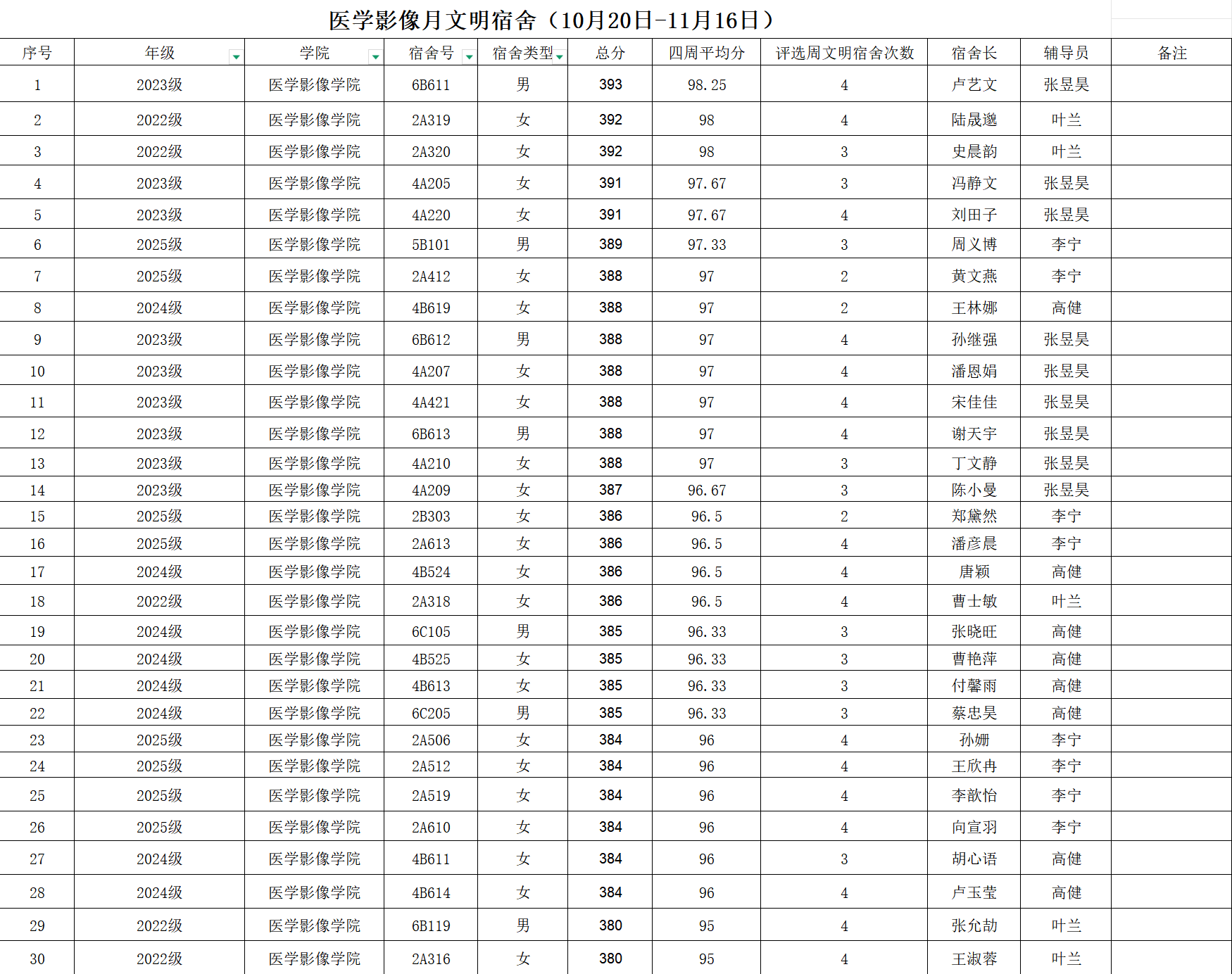 据《皖南医学院“安全文明宿舍”评选办法 (修订)》、《医学影像学院文明宿舍评选实施细则》文件要求及评选标准,共评选30间“月文明宿舍”,现进行公示。