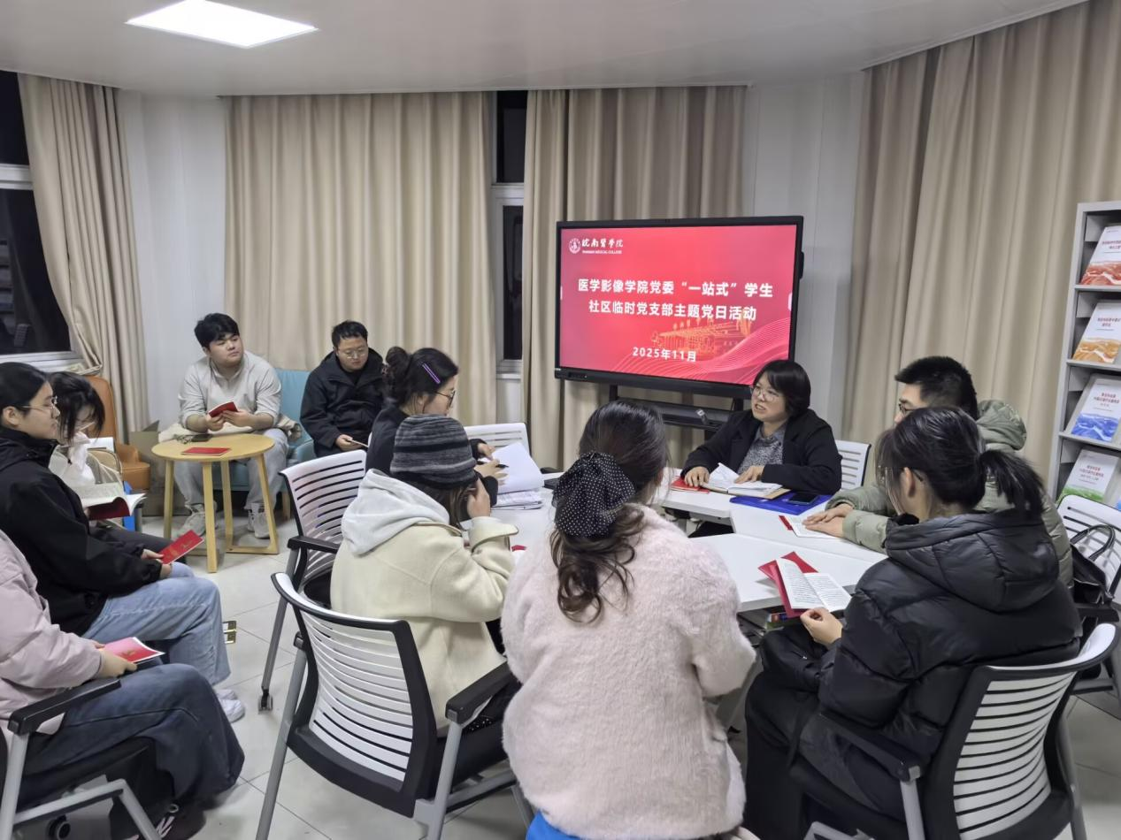 为筑牢党员思想根基、深化“一站式”学生社区党建育人实效,2025年11月27日,医学影像学院党委“一站式”学生社区临时党支部在学生6号公寓一站式社区举办主题党日活动。学院党委书记王爱侠、4号、6号学生公寓“一站式”社区临时党支部书记张昱昊、副书记高健、部分党员及入党积极分子齐聚一堂,以理论学习强党性、以交流研讨促提升、以实地走访暖人心,推动主题党日活动走深走实。
