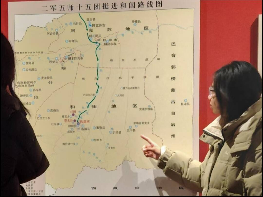 新疆和田博物馆内,队员们以解放军进军和田的历史为主线,讲述1800余名官兵横穿塔克拉玛干沙漠、徒步千里解放和田的英雄故事,以及沙海老兵扎根边疆、屯垦戍边的奋斗历程。标准的语言表达跨越民族与地域的界限,让沙海老兵的坚守与奉献被更多人知晓,让边疆的红色记忆在顺畅的交流中延续。
