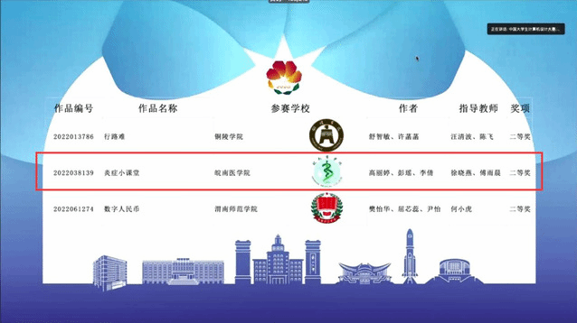 2022年7月28日-30日,由中国大学生计算机设计大赛组织委员会主办的第15届中国大学生计算机设计大赛决赛(微课与教学辅助类)在沈阳东北大学顺利举行,来自四川大学、国防科技大学等全国537所高校共计1440支参赛队伍入围决赛,医学影像学院19级影像专业高丽婷、彭瑶、20级生工专业李倩三位同学凭借设计精巧、制作精湛的作品《炎症小课堂》荣获得全国决赛二等奖。